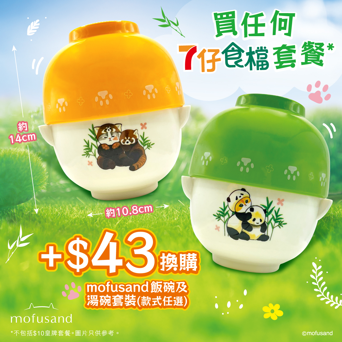 mofusand飯碗及湯碗套裝換購 買任何7仔食檔套餐* +$43即可以換購mofusand飯碗及湯碗套裝一套 部份貨品只限於指定店舖提供。貨品數量有限,售/換/送完即止。所有價格以個別店舖為準。貨品圖片只供參考。就一切有關事宜,7-Eleven將保留最終之決定權。