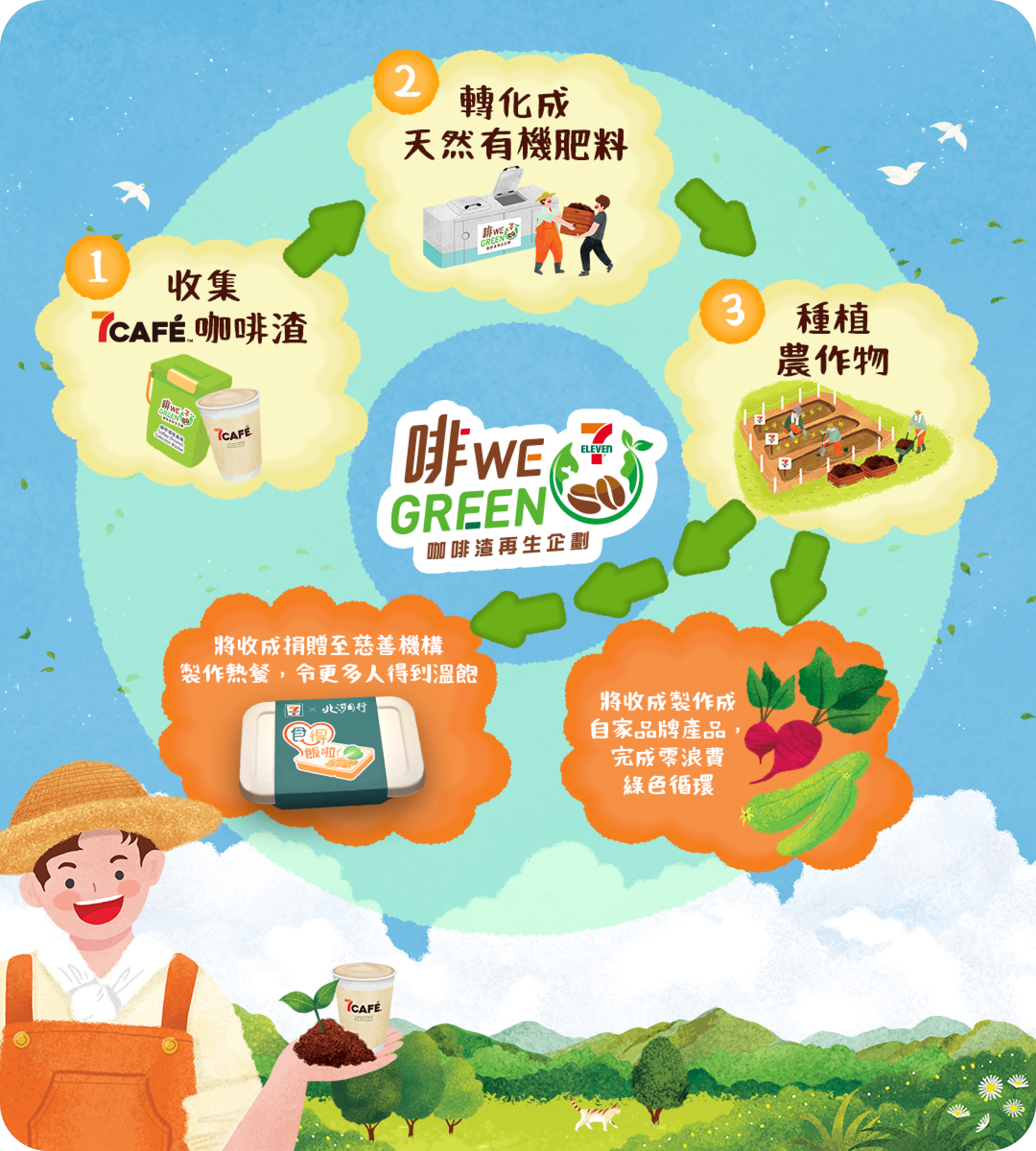 7-Eleven夥拍不同農場,以7CAFÉ咖啡渣轉化成有機肥料,再將栽種的農作物製作成7-SELECT產品,轉廢為材,讓咖啡渣以新面貌重生,實踐綠色循環經濟,令我們的日常飲食,添加多重環保意義。
