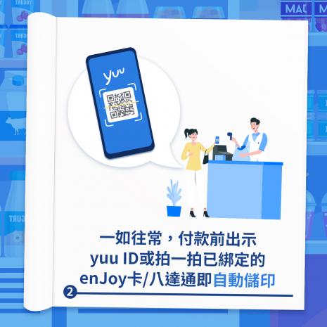 於付款前出示yuu ID或拍一拍已綁定的enJoy卡/八達通即自動儲印